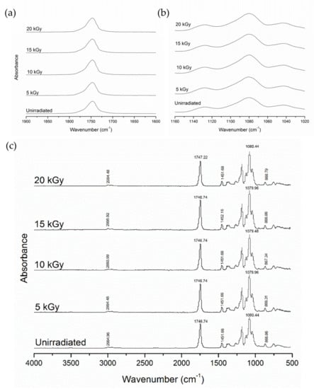 FTIR spectra from samples irradiated at 0, 5, 10, 15, and 20 kGy in the absence of oxygen, followed by exposure to air after irradiation. (a) Comparison of spectra within the range of the C=O peak; (b) comparison of spectra within the range of the C-O peak; (c) full spectra.