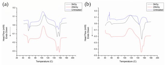 The cold crystallization and softening points were found to be on average 122.1 ± 1.7 °C and 153.3 ± 2.2 °C, respectively. The average transition temperatures for irradiated samples slightly decreased with increasing dose due to chain scissions resulting in shorter chains. A negligible ratio of crystallinity was found to be 1.2% on average in unirradiated samples. With increasing radiation dose, an increase in crystallinity was observed, with crystallinity of 2.4 ± 0.12% at 5 kGy and 7.3 ± 0.4% at 20 kGy. A larger increase in crystallinity was expected []. However, the steric hindrance on the backbone of the PLA chains impeded crystallization of these broken chains.