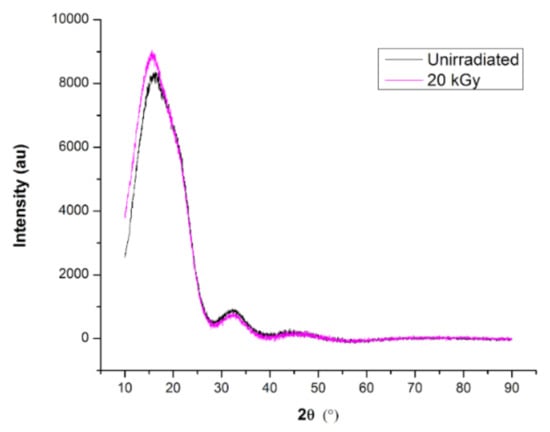 Diffractograms for unirradiated and 20 kGy irradiated PLA.