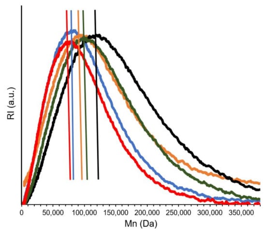 Number average molar mass distributions for the unirradiated sample (black) and samples irradiated at doses of 5 kGy (green), 10 kGy (orange), 15 kGy (blue), and 20 kGy (red). The lines represent the number average molar mass Mn value (center) of each trace at the peak of the distribution.