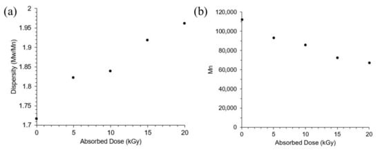 (a) Polymer dispersity as a function of absorbed dose of 0, 5, 10, 15, and 20 kGy, where dispersity is the weight average over number average molar mass; (b) number average molar mass Mn versus absorbed dose of 0, 5, 10, 15, and 20 kGy.
