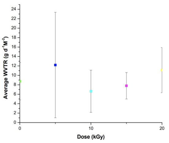 Analysis of the data indicates that there is no notable effect of irradiation dosage on WVTR of PLA. Based on the EPR and GPC results, an increase in the WVTR was expected after irradiation of the PLA. It has been shown that chain scission increases the WVTR of the polymer as it reduces the pathway tortuosity, or the number of barriers that the water vapor molecules must overcome [,]. However, in this study PLA was irradiated only up to a dose of 20 kGy and this resulted in low chain scission yields which did not have an impact in the WVTR.