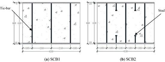 20] compared the flexural behavior between a SC composite beam with 42 tie-bars and a SC composite beam with 42 tie-bars and 56 studs. The experimental results indicated that the interfacial shear distribution can be affected by the shear connection ratio, and the added studs did not significantly improve the ductility and energy dissipation capacity of the SC composite beams under out-of-plane cyclic loading.