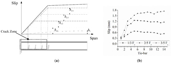 When the concrete is cracked, the steel plate and shear connectors are still elastic, and the interfacial slip distribution of shear connectors should be trapezoidal due to the occurrence of vertical cracks in concrete. The concrete cracks occurred and widened with the increase in loading. The difference between the reinforced concrete beam and SC composite beam is that the cooperative deformation of concrete and longitudinal rebars in reinforced concrete beam depend on the end anchorage of rebars and the rib on the surface of rebars, and the cooperative deformation of concrete and steel plate in the SC composite beam only relies on shear connectors. Thus, the vertical cracks usually occurred around shear connectors. The authors conjectured that the slip of shear connectors was approximately equal to the summation of the width of cracks between the shear connector and the fixed end. Thus, the interfacial slip distribution of the shear connectors could be trapezoidal, and the turning point was close to the farthest crack, as shown in
