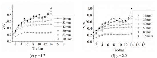 For the SC composite beam with 1.0 shear connection ratio, the V/Vu versus displacement curve is also approximately trapezoidal. However, for the SC composite beam with a 1.3 shear connection ratio, the V/Vu versus displacement curve is approximately bilinear, and the V of the first five rows of tie-bars increases significantly with the increase in span. The V of the tie-bars far away from the fixed end increases slightly with the increase in span. For the middle shear connection ratio, the V/Vu versus displacement curves are significantly variable. Meanwhile, the V of tie-bars close to the maximum bending moment are also significantly lower than the Vu of the tie-bars.