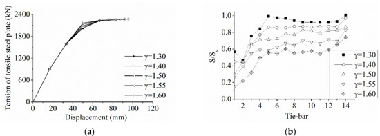 Figure 13a shows the tension of the steel plate versus the displacement curves of the SC composite beams. It indicates that the ultimate tension of the steel plate and the ultimate displacement increase with the increase in the shear connection ratio.