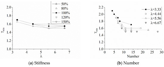 Figure 14b. It is shown that the minimum shear connection ratio of the SC composite beam decreases with the increase in the number of tie-bars. Meanwhile, the influence of the number of tie-bars on the minimum shear connection ratio of SC composite beams with more than 10 tie-bars could be negligible. Therefore, the minimum number of tie-bars in the SC composite beam between the maximum bending moment and zero bending moment was suggested as 10.