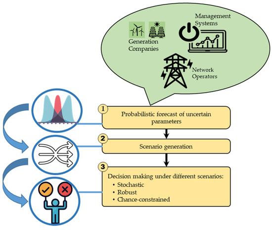 To the best of the authors’ knowledge, there is no comprehensive review paper proposing a comprehensive framework for smart grid decision-makers and stakeholders based on the probabilistic forecasting of all uncertain inputs (wind, PV, price, load, etc.). In addition, the applications of probabilistic forecasts and the decision-making pathway were not fully assessed in the previous literature. The decision-making process should have three main stages, including forecasting, scenario generation, and developing optimization problems. Thus, this paper is proposed to resolve this issue as follows: