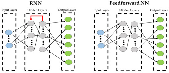 In general, an NN has three layers—an input layer, an output layer and one or several hidden layers. A feedforward ANN passes the data forward from input to output. On the other hand, a recurrent NN (RNN) can connect some neurons in a backward direction as well as the forward direction for further processing. In this way, RNNs have the ability to consider the autocorrelation or time dependencies of data [22]. Figure 2 compares the architecture of a feedforward NN with that of an RNN. The literature proposed various architectures and developed probabilistic forecasting models for both feedforward and recurrent ANN-based models. In the following, some important models are reviewed.