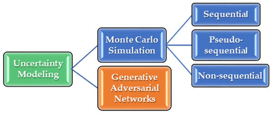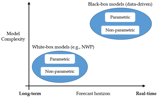 By contrast, non-physical or so-called “black-box” forecasting approaches that predict PV generation are purely based on historical data and do not deal with the physical process and the meteorological data. For instance, ref. [32] developed a probabilistic forecasting model using ANN and an analog ensemble to produce 72-h forecasts of PV power. Additionally, ref. [33] utilized a more complicated approach, long short-term memory (LSTM), to probabilistically predict solar power and compared it with simpler models. Similar to NWP models, although physical models may be more accurate in day-ahead and long-term horizons, data-driven black-box models work better over short-term horizons such as intra-hour ones [38,39]. Figure 4 summarizes the probabilistic forecasting models for PV generation considering the forecasting horizon.