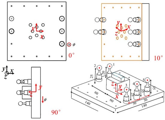In order to quantify the deviation resulting from gravity (), three expected positions are measured as shown in Figure 2. One position is the horizontal position () meaning that the mounted ball bar plane of the fixture is parallel to the horizontal plane which is used as a reference position for the 0° position. The second position is the vertical position () that is perpendicular to the horizontal plane as the 90° position. The third position is the 10° position () from the horizontal position. The units of measurement of the artefact are mm.