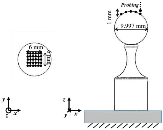 In this study, a five-axis ultra-precision machine tool incorporated with the developed on-machine measurement system as shown in Figure 1, is used to evaluate the working volumetric error with the fiducial-aided artefact. The positions of fiducials in the artefact are provided by using the probing system for each re-localization of the artefact. A total of 30 points in a 6 mm × 6 mm area are sampled uniformly on one standard sphere to guarantee its center position using the least square method. The calibrated diameter of the spherical fiducial was 9.997 mm. Figure 3 illustrates the probing directions.