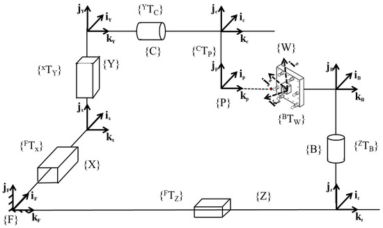 The homogenous transformation matrix described in Equation (3) is a powerful approach to connect the positions of the fiducials in different coordinates and each single error can be synthesized as a volumetric error.