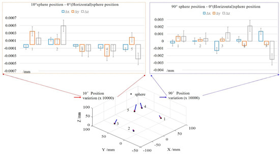 where , , are the mean sphere center coordinates with repeating measurement 3 times. is the total position variation of the sphere. The effect of gravity is measured, and discussed in Section 3.1.
