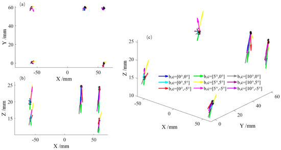 Distribution of the volumetric errors of the multi-axis machine tool occupied by the workpiece at nine locations by rotating the b and c axes: (a) xy view, (b) xz view, (c) 3D view, the errors are multiplied by 10,000.
