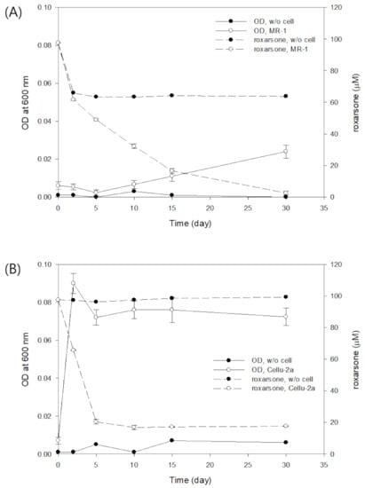 In the case of the strain Cellu-2a, the maximum growth was observed up to OD600 of 0.090 ± 0.005 at 2 days, using sucrose as a carbon source (Figure 1B). Since the strain Cellu-2a has been reported to grow fermentatively with sucrose in the previous study [21], the rapid growth was assumed to be due to fermentation. The roxarsone concentration decreased rapidly to 5 days and reached to 16.8 ± 1.4 µM at 10 days from the initial 97.6 ± 0.1 µM (Figure 1B). In the abiotic control, no obvious reduction of roxarsone was observed throughout the incubation (Figure 1B). For comparison of both strains, it seemed that Cellu-2a was better for roxarsone reduction than MR-1, possibly by forming larger cell mass through fermentative growth.