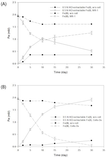 In the indirect experiment with strain MR-1, ferrous iron was found to increase up to 10 days and started to decrease gradually from 10 days to 30 days (Figure 3A). The decrease of Fe(II) may be caused by heterogeneous reduction of roxarsone on the solid Fe(II) phases of the partially reduced HFO, which is, in turn, supported by the rapid decrease of roxarsone from 10 days in Figure 2A. This suggests that the reduced Fe(II) on HFO might have acted as a reductant for roxarsone. In the previous publication by Chen et al. [15], it was reported that strain MR-1 reduced 1 mM roxarsone almost completely within 40 h in the presence of soluble phase of ferric-citrate, which was much faster than the incubation without ferric-citrate. However, in this study, with solid phase Fe of HFO, the roxarsone decrease was delayed (Figure 2A), compared to the direct reduction without HFO (Figure 1A). Once reduction of HFO generated Fe(II) on solid surface of HFO, roxarsone decreased relatively rapidly (Figure 2A). From this observation, it could be speculated that roxarsone would react both with soluble Fe(III) and solid phase Fe(II). In addition, the differences of incubation conditions such as concentrations of electron donor, electron acceptor, and media composition might have affected the microbial metabolic activities on roxarsone reduction in both studies. In the case of strain Cellu-2a, there was no observation of decrease of the generated Fe(II) (Figure 3B), and ferrous iron concentration increased up to 1.91 ± 0.06 mM, which was a near complete reduction of the initial HFO (1.96 ± 0.03 mM) (Figure 3B). Looking at the roxarsone decrease and Fe(II) production patterns together in the Cellu-2a incubations (Figure 2B, Figure 3B), it seemed that there was no indirect reduction of roxarsone by the generated Fe(II). Instead, the strain Cellu-2a might have reduced roxarsone directly even with added HFO in fermentation conditions.