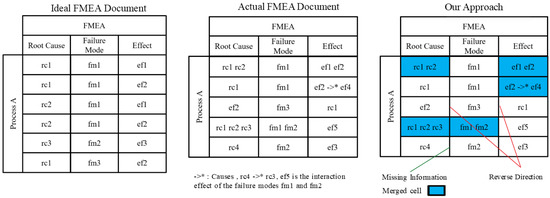 Comparison between ideal FMEA and actual FMEA. Cases of merged cells are highlighted with background color. Cases of missing information and reversed direction are indicated between the FMEA cells. Our approach is mainly concerned with detecting and assessing the consistency impairments in FMEA documents. There are two main categories of consistency impairments in FMEA documents, which are (1) cell consistency and (2) relation consistency. In the cell consistency category, cases of merged cells are noted. In such cases, the short text describes more than one concept. In the relation consistency, cases of missing information and conflict in the direction of the causal relation are noted. In these cases, although the FMEA documents still conform to the tabular format, the content of the FMEA does not conform to the intended semantics.