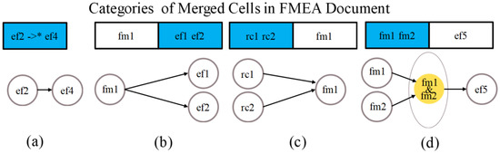 To summarize, in the category of FMEA documents’ cell consistency impairments, we noticed cases of merged cells, for which we further categorized into four categories, based on our observation of real-world FMEA documents. These four categories of merged cell types are depicted in Figure 2 and can be described as: