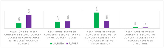 Based on the analysis of the relations present in P_FMEA and UP_FMEA, the percentages of relations that are out of scheme in P_FMEA and UP_FMEA are 37% and 22%, respectively. Additionally, the number of relations in P_FMEAs is six times higher than UP_FMEAs. Moreover, we noticed that both types of documents have consistency impairments concerning the causal relation. Additionally, the percentages of the relations between concepts within the same concept class and those that indicate reversed direction are comparable between the UP_FMEA and P_FME documents. However, in UP_FMEA, the relations with missing information are more present. Thus, we think that the definition of the scope of UP_FMEA is insufficient. Consequently, an increasing number of relations with missing information are observed. The comparison of relation type distribution present in P_FMEA and UP_FMEA is depicted in Figure 5.