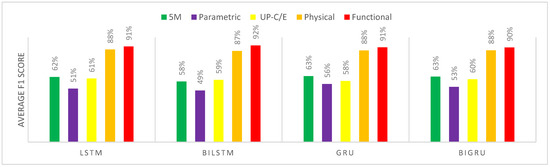 Based on the first evaluation approach, we noticed that all the classifiers’ architecture performances drop with respect to minority classes (i.e., the lower three classes that are the least represented in the collected dataset). However, with respect to the Functional and the Physical concept classes, LSTMS and Bidirectional LSTMS surpass the other architecture by a small margin. The results of the comparison are depicted in Figure 6 and summarized in Table 1. Additionally, Table A1 (a full table of results) is added to Appendix A.