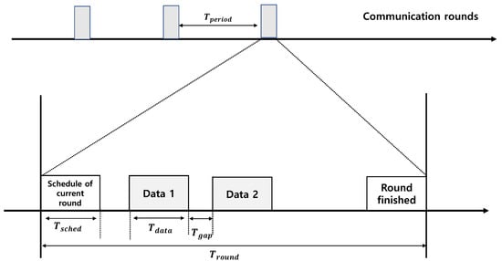 Figure 2 presents an illustration of each round and slot structure in the LWB. Each round consists of a slot for the current round schedule, n data slots, and round finish slots. All nodes repeat each round at every time period, and time for the round is . Each round begins with the schedule of the host, . In this slot, the host node computes the scheduling for the network and broadcasts it to the source nodes. Upon receipt of the scheduling information, one source node becomes the initiator in the allocated slot and launches the Glossy flooding communication. One-hop nodes within the initiator’s transmission range simultaneously receive the transmission and relay all packets simultaneously after the precise processing period. Repeated flooding enables nodes greater than two hops to receive packets sent by the initiator. In a multihop network, the LWB provides reliability exceeding 99.9% under real-world scenarios [8]. Additionally, nodes do not maintain any network state, making the LWB highly robust to network dynamics that result from misbehaving or failing nodes and wireless interference.