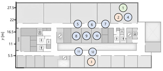 Figure 7 shows a testbed used in WSANs experiments. It is a floor plan in which the network nodes are arranged, where the distance between a transmitter (node-3) and receiver is 30 m. The TelosB motes have indoor transmission coverage of 20–30 m, which can be diminished by signal attenuation from the walls on the building. However, the distance between each node is less than 10 m. Therefore, in the experiments, we do not consider transmission failures by the physical signal attenuation or obstacles. Furthermore, to minimize the interference by other wireless communications, such as WiFi communications by smartphones, we conduct the experiments at night time.