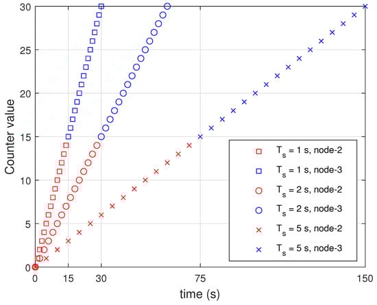 Node-2 was programmed to transmit 2 B data, including its own node number (1 B) and counter value (1 B), to the host node. The counter value increased by 1 every round. We stopped the operation of node-2 when the counter value reaches 15 and checked whether node-3 was working properly. We checked if switching could take place in the current round. Figure 8 presents the performance of the proposed switching algorithm by changing to 1, 2, and 5 s. We conducted the experiment 10 times for each . When the transmission of node-2 (red marker) was stopped, node-3 started transmission (blue marker) as shown in Figure 8. Results indicate that the proposed network scheduling and algorithm for switching can be applied for control systems.