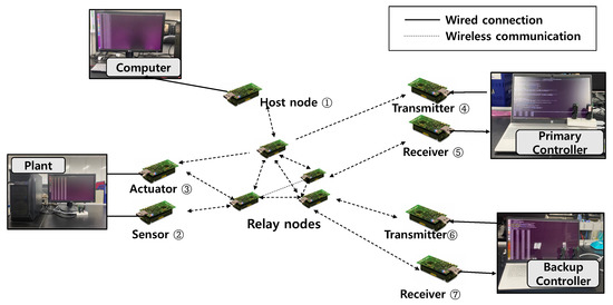 The controller also consisted of a transmitter node and a receiver node. Here, two nodes were used to reduce the delay caused by USB serial communications. In [26], an additional piece of equipment called Bolt was used to reduce computation delays. To reduce delays instead of using additional equipment, we employed two nodes for separately receiving and transmitting radio communications. The receiver node was only used to send the received data from network to computer, whereas the radio transmission node was used to receive data from the computer. This configuration reduced the computation delay between computers and motes at a low cost in a general-purpose control system. Apart from the relay node, five nodes were required by default, and two more were required for the backup controller.