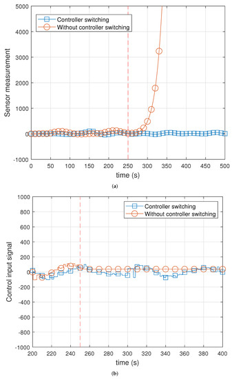 Experimental results on plant with/without controller switching mechanism. (a) Sensor measurements; (b) control input signals.