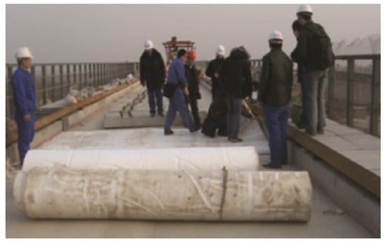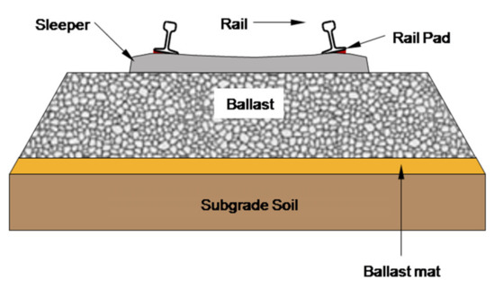 Because of the high cost of and technical issues associated with the new ballastless tracks, the traditional ballasted railway tracks are still deployed extensively throughout the world today. For ballasted tracks, ballast mats have been considered as an effective solution to reduce train-induced vibrations [15]. Figure 1 shows the cross-section of a ballasted track with a ballast mat, and Figure 2 shows the installation of a polyurethane ballast mat in China.