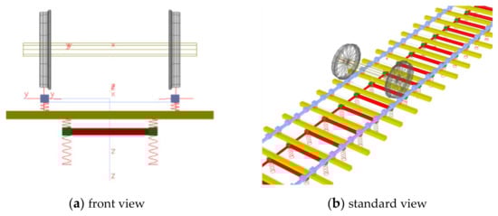 To study the dynamic performance of the ballast mat, a three-dimensional coupled wheel–rail model is implemented. The model can be divided into three parts, the wheel submodel, the rail submodel and the under-rail track component submodel, which contains the fasteners, the sleepers, the ballast and, when applicable, the ballast mat. The schematic diagram of the coupled model is shown in Figure 3.