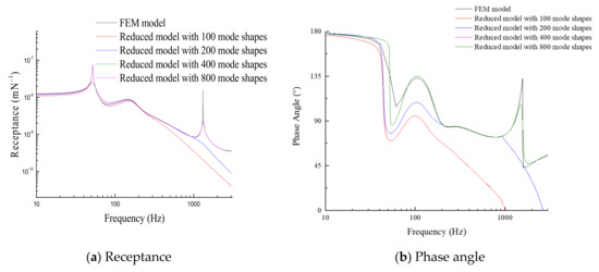 where D denotes the driving-point displacement response, F denotes the excitation force and φ denotes the phase angle difference between the excitation force and driving-point response. Using the receptance equations above, the track receptance at the mid-span between sleepers are compared with the exact solution in FEM in Figure 5. It can be seen that as the number of mode shapes increases, the results of the proposed model are becoming closer and are converged to the results of the fully-detailed FEM model. All models have shown the first two resonance frequency at around 51.7 Hz and 149.3 Hz. When only considering 100 and 200 modes, the results fail to simulate the third resonance frequency at around 1570.8 Hz. When the quantity of modes chosen is greater than 400, the receptance of the proposed model are getting converged. So, in the following, the number of eigenmodes is chosen as 800.