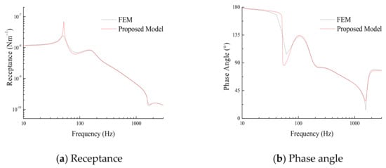 To ensure that the flexible model proposed here is reliable, the receptance and phase angle at the sleepers mid-span and above the sleepers are compared with a model based on Finite Element Method (FEM). The comparison results are shown in Figure 6 and Figure 7.
