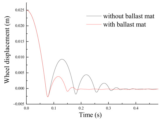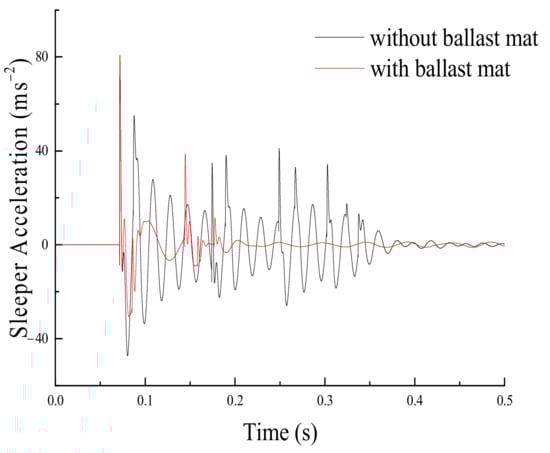 Figure 8, Figure 9, Figure 10 and Figure 11 show the wheel displacement and rail, sleeper and ballast acceleration in the time domain for the ballasted track with and without the ballast mat. In Figure 8, it is observed that when no ballast mat is considered, the wheel movement comprises four major jumping and bouncing processes on the ballasted track. When the ballast mat is installed, the wheel exhibits only two jumping and bouncing phenomena, indicating that the ballast mat greatly improves the track elasticity characteristics. Moreover, the height of the first bouncing of the wheel for the track without the ballast mat is 9.33 mm, which decreases by nearly 59.1% to 3.82 mm when the ballast mat is installed.