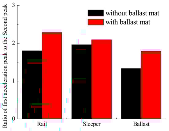 The ratios between the first acceleration peak on the first and second wheel impacts are shown in Figure 11 and presented in Table 2, where a larger ratio indicates a better vibration reduction. The results from Table 2 indicate that the ratios for the case with ballast mat are all higher than those for the case without mat, which demonstrates that the installation of the ballast mat can provide higher resilience and elasticity for the ballasted track. Figure 12 also shows that the ratio increases less for the sleeper, indicating that the ballast mat is better to reduce vibration on the rail and ballast than on the sleeper.