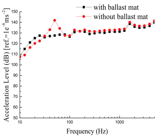 Figure 13, Figure 14 and Figure 15 show the power spectra of the rail, sleeper and ballast accelerations in the frequency domain. The results show that after the installation of the ballast mat, the rail vibration at approximately 50 Hz is significantly decreased, but the pinned–pinned resonance vibration remains nearly unchanged. For the sleeper and ballast, the vibration at approximately 50 Hz is mainly distributed when no ballast mat is present and is greatly attenuated when the ballast mat is installed.