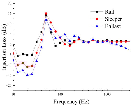 In this study, insertion loss is adopted as an indicator of how well the ballast mat reduces vibration. The effectiveness of vibration reduction in the frequency domain is studied based on the one-third octave analysis of the rail, sleeper and ballast accelerations. Figure 16, Figure 17 and Figure 18 show the vibration levels for the rail, sleeper and ballast for tracks with and without the ballast mat. Figure 19 shows the insertion losses of the rail, sleeper and ballast after the ballast mat is installed.