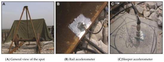 A wheelset drop test was performed on the connection line of Xuzhou East Station (China) to obtain rail and sleeper acceleration data. The wheelset weighs 1.2 tons and is lifted and dropped from a 25 mm height over the rail surface onto the mid-span between two sleepers. The equipment used for lifting and dropping the wheelset is shown in Figure 20A. The test segments consist of two ballasted tracks, one with and another without the ballast mat, on a concrete rail bridge. The track structure consists of a CHN60 rail, a type II elastic fastener, a type III concrete sleeper and a ballasted track bed with and without the ballast mat. Accelerometers are fixed on the rails and sleepers, as shown in Figure 20B,C. The accelerometers on the rail and sleeper can measure accelerations up to 1000 g and 100 g, respectively. The sampling rate was chosen as 10 kHz.