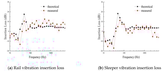 The wheelset drop test performed in this study indicates that it is an effective method to obtain the dynamic characteristics of track structures. The accelerations of the rail and sleeper are obtained through the test and the insertion losses of the rail and sleeper are obtained through the one-third octave analysis. The numerical insertion losses are compared with the experimental results, and a good agreement is found in the frequency range of 0 to 600 Hz. A slight difference exists between the predicted insertion losses and the measured data. The possible reason for the difference between the field test and numerical calculation results can be attributed to the intrinsic nature of the discreteness and randomness of the ballasted track bed [31,32]. Essentially, the ballasted track bed is consisted of granular particles of different sizes and is subjected to moving vehicle loads and maintenance loads such as tamping [33]. Thus, the system parameters cannot be easily taken as a uniform determined value and need further calibration by trial-and-error tests. The methodology proposed in this paper assumes that the ballasted track bed is regarded as the lumped-mass system [34] and certainly behaves slightly different from the discrete dynamical systems. However, the comparison results showed that even with this slight difference, the model established in this paper could grasp the intrinsic dynamic properties of the ballasted track system and showed good agreement with the test results. Future possible solutions can be achieved by carrying out simulations based on the discrete element method [35,36].