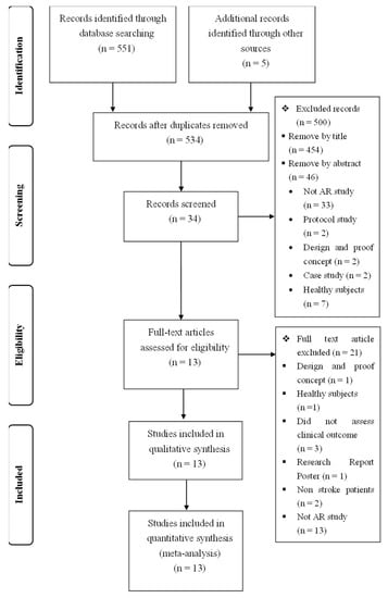 This review aims to determine the effectiveness of AR on upper limb function, gait and balance based on collected publications. Articles were selected and analyzed following the Preferred Reporting Items for Systematic Review and Meta-Analyses (PRISMA) guidelines [22]; it should be noted that the protocol was not registered.