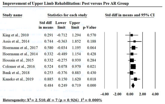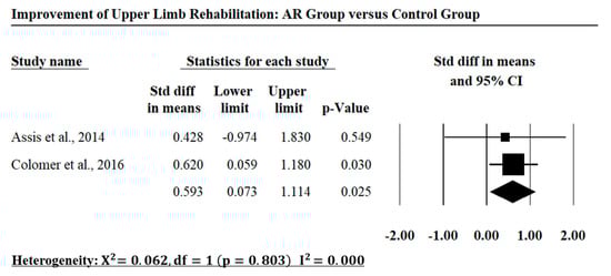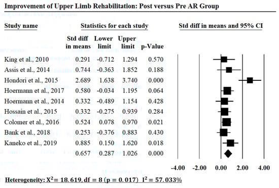 The meta-analysis results of the included investigations in comparing between the AR group and the conventional therapy group of the upper limb rehabilitation.