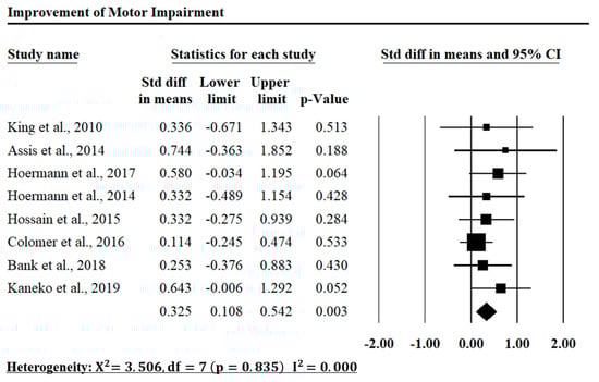 The meta-analysis results of the included investigations in the motor impairment improvement of the upper limb rehabilitation.