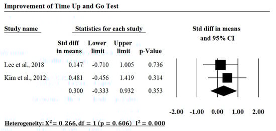 On the function of lower limb rehabilitation, four studies with 79 participants measured the effects of AR intervention. All studies consisted of people who were chronic stroke survivors. The meta-analysis showed that the overall effect of the AR was SMD = 0.520 (95% CI = 0.039~1.001, p < 0.05, Figure 8). Nevertheless, there was no significant effect on the Berg balance scale (BBS) (SMD = 0.405, 95% CI = −0.112~0.921, p = 0.125; Figure 9) nor time up and go (TUG) (SMD = 0.3, 95% CI = −0.333~0.932; p = 0.353; Figure 10). Although there was a moderately significant improvement of the AR intervention versus the conventional therapy, the AR intervention was only used to increase the dose of usual care. It means that these collected studies used the comparison of conventional therapy alone versus an AR intervention plus conventional therapy. Consequently, the AR group had more treatment duration than the control group. This induced a positive tendency of the AR group due to the greater intensity and frequency of rehabilitation.