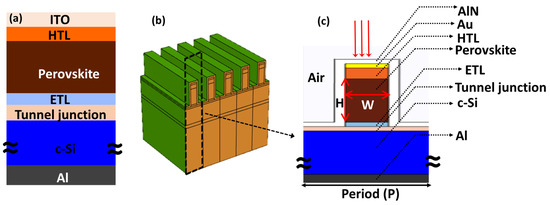The 5 nm-thick hydrogenated amorphous silicon layers are to facilitate the charge carrier transport in the c-Si subcell by generating the required built-in potential in the junction. Due to their small thickness, their optical effects are negligible and they will be ignored in our model [7,39]. In the proposed design we replaced the ITO thin film top contact with a nanostructured metallic electrode. The perovskite multilayer cell structure is distributed as a 1D rectangular grating on top of the cSi cell, which includes a gold thin film 20 nm-thick on top of it (refractive index from [32]). Figure 1b,c show the top perovskite cell layers arranged as a multilayer grating with a period nm. As we see in Figure 1c, the width of the perovskite cell layers and the gold contact is the same, W. Both the width and the thickness of the perovskite layer, W and H, are the geometrical parameters that we optimized. Finally, we used a thin dielectric layer of aluminum nitride (AlN) as a protective coating. This material is being included in a wide variety of optoelectronic sensing devices because of its good biocompatibility and mechanic–electrical properties and is typically fabricated by sputtering technique [40]. The wavelength-dependent refractive index data for AlN was extracted from a standardized table [30]. Our design incorporates this material as a thin film, having a thickness of 50 nm. We have checked that the addition of this layer does not compromise the performance of the cell.