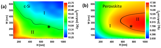 Short-circuit current maps in terms of the thickness, H, and width, W of the perovskite layer, for the c-Si cell (a) and the perovskite cell (b). The black line represents the value of the short-circuit current obtained for the reference planar cell. Regions I and II contain the configuration delivering a smaller or larger than the planar tandem cell, respectively. The black star denotes the configuration selected in this contribution, meeting the equal short-circuit current condition in both cells of the tandem configuration.