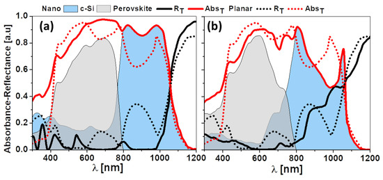 Absorption and reflection for (a) TE and (b) TM cases. The gray color region represents the absorption of the perovskite active layer and the light blue color region is for the absorption at the c-Si active layer. The red solid line denotes the total absorption in the active layer for both of them and the black solid line is the total reflection of the nanostructure cell. The red and black dotted lines show the total absorption in perovskite and c-Si active layers and total reflection for the planar solar cell, respectively.
