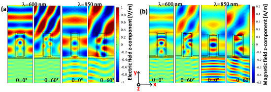 Electric field (a) and magnetic field (b) maps for the TE and TM polarizations, respectively. These maps were calculated for short and long wavelengths ( nm and nm), and for normal and oblique incidence conditions ( and ).