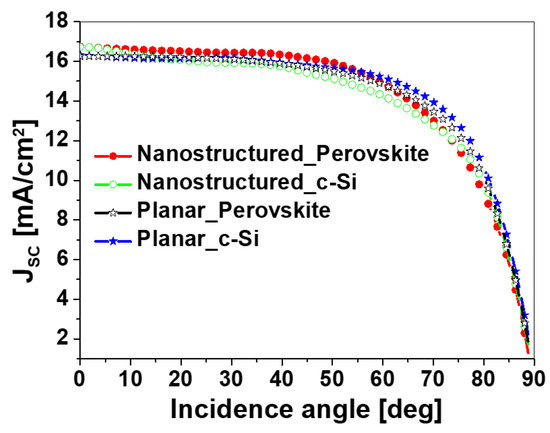 Short-circuit current as a function of the angle of incidence for the nanostructured and planar solar cells. The red line with closed circles is for the perovskite cell and the green line with open circles is for the c-Si in the nanostructure cell. The black line with open stars is for the perorvskite cell and the blue line with closed stars is for the c-Si in the planar cell.
