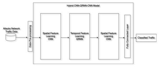 In this section, we discuss the proposed hybrid DL model in terms of its structure, the selected DL algorithms, and relevant theoretical concepts. The selected DL models (CNN and QRNN) can be used to classify a threat type in real time while providing a low FPR. The architecture of the proposed model is presented in Figure 1.
